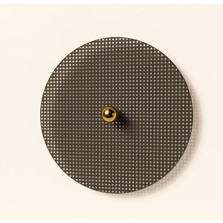 Настенное бра, выполненное из метелла и ротанга в современном стиле. Состоит из металлического фиттинга размером 10 см золотого цвета и рассеивающего диска из ротанга 60 см в черном цвете.