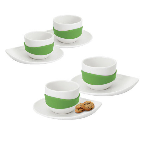 Набор из 4-х чашек для эспрессо из высококачественного фарфора, с силиконовой термоизоляционной вставкой посредине. Благодаря этой вставке вы не обожжете пальцы, чашечку держать в руках удобно и приятно. Форма блюдца в виде листа дерева позволяет поставить чашку, а рядом положить пару печенек или конфету. Идеальный вариант для как для "кофе в постель", так и для приема гостей.