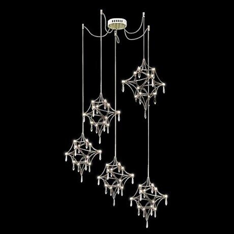 Люстра Mariah 5 хромИзысканный подвесной светильник ручной работы из пяти стилизованных «плафонов» удачно дополнит обстановку гостиной, столовой, холла, спальни. Изящное сочетание кружевного металлического каркаса, граненых подвесок и ярких огней светодиодов создает приподнятое настроение. Смотрится нарядно и вместе с тем элегантно. Подходит для оформления помещений в неоклассическом стиле, в стилистике ар-деко, модерн, фьюжн, а также интересно сморится в минималистичном окружении, создавая яркий акцент. В люстре Mariah 5 используется каркас из тонких прутков нержавеющей стали. РЦоколь:LEDЦветовая температура:3000КДиммирование:нетКоличество светодиодов:60Световой поток, lm:3600Мощность, вт:30Степень защиты:IP20Крепление:Потолочная площадка; Цанговый подвесДлина тросов:150 см