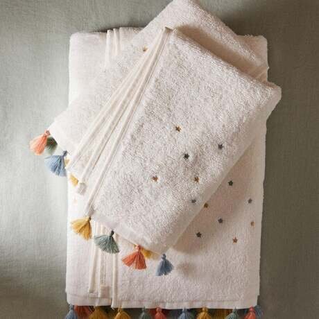Детское хлопковое махровое банное полотенце с цветной вышивкой звезд и кисточками.
