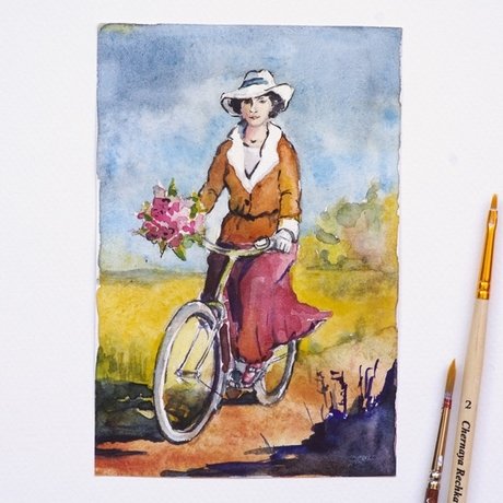 Вечерняя велосипедная прогулка среди зеленых лугов острова Шату. Смотря на тревожное небо кажется, что собирается гроза, но художница мастерски передала невероятное солнечное настроение ранней осени. Девушка в шляпе подобна цветку — так она свежа и красива. Хотя картина имеет более чем скромные размеры, она словно светится изнутри, ее переполняют невероятно яркие и сочные краски!