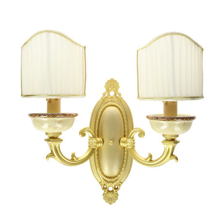 Бра 2х-рожковое из коллекции CORINTO на металлической арматуре золотого цвета. Керамические чашечки с орнаментом. Текстильные абажуры цвета слоновая кость с золотым кантом скрывают лампы. Количество лампочек: 2. Мощность: 2 x 60 Вт. Тип лампы: Накаливания, E14.