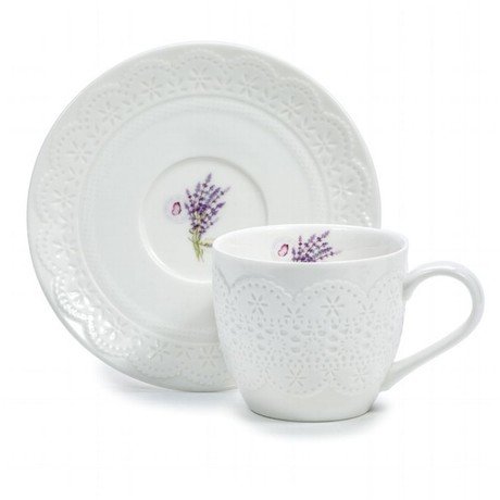 Красивая чайная пара придется по вкусу и ценителям классики и тем, кто предпочитает изящность и утонченность. Оригинальное тиснение по краю блюдца и по внешней стороне кружки дополнено прекрасным цветком лаванды. Все изделия из европейской коллекции "Уютный Дом-Лаванда" отличаются "итальянской красотой" и стильным дизайном.